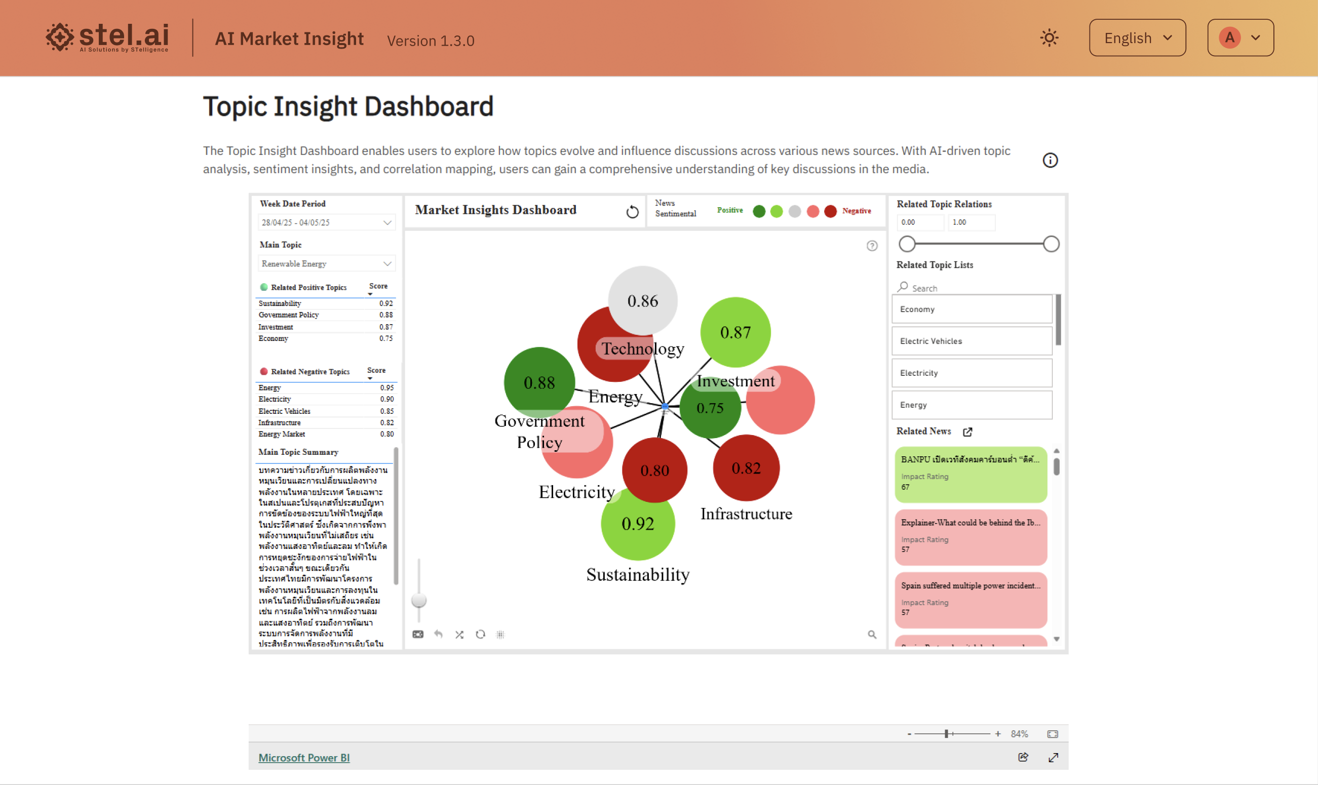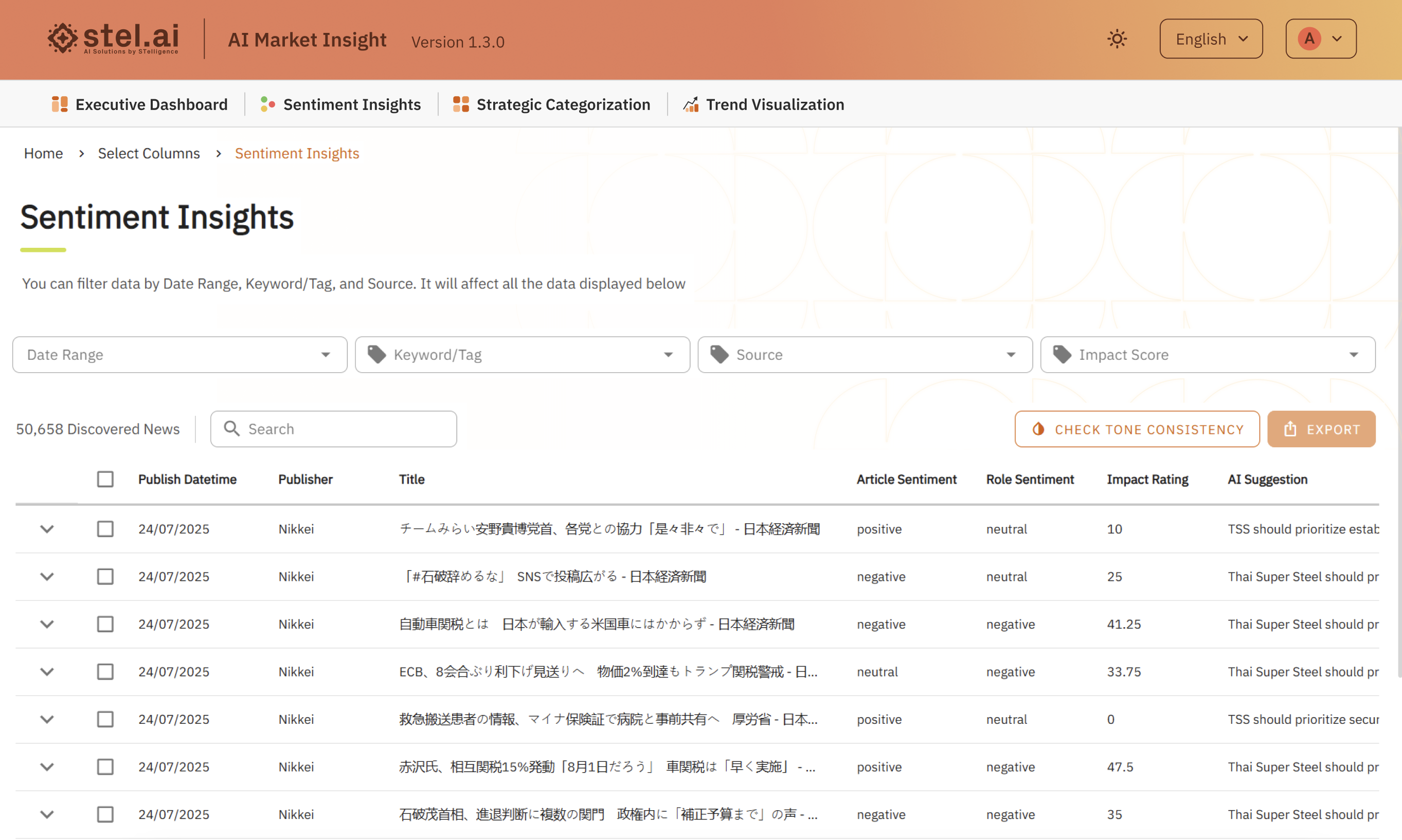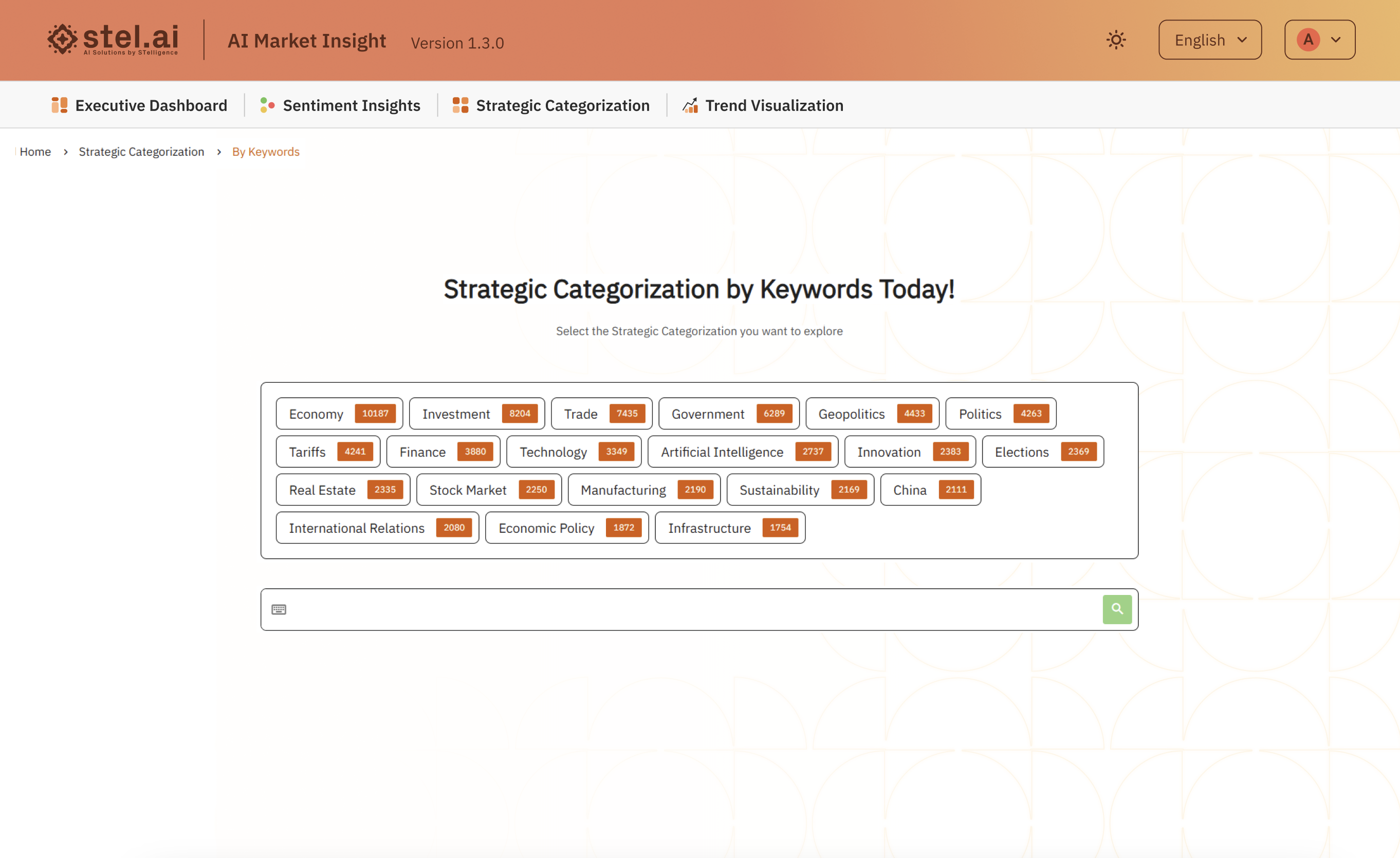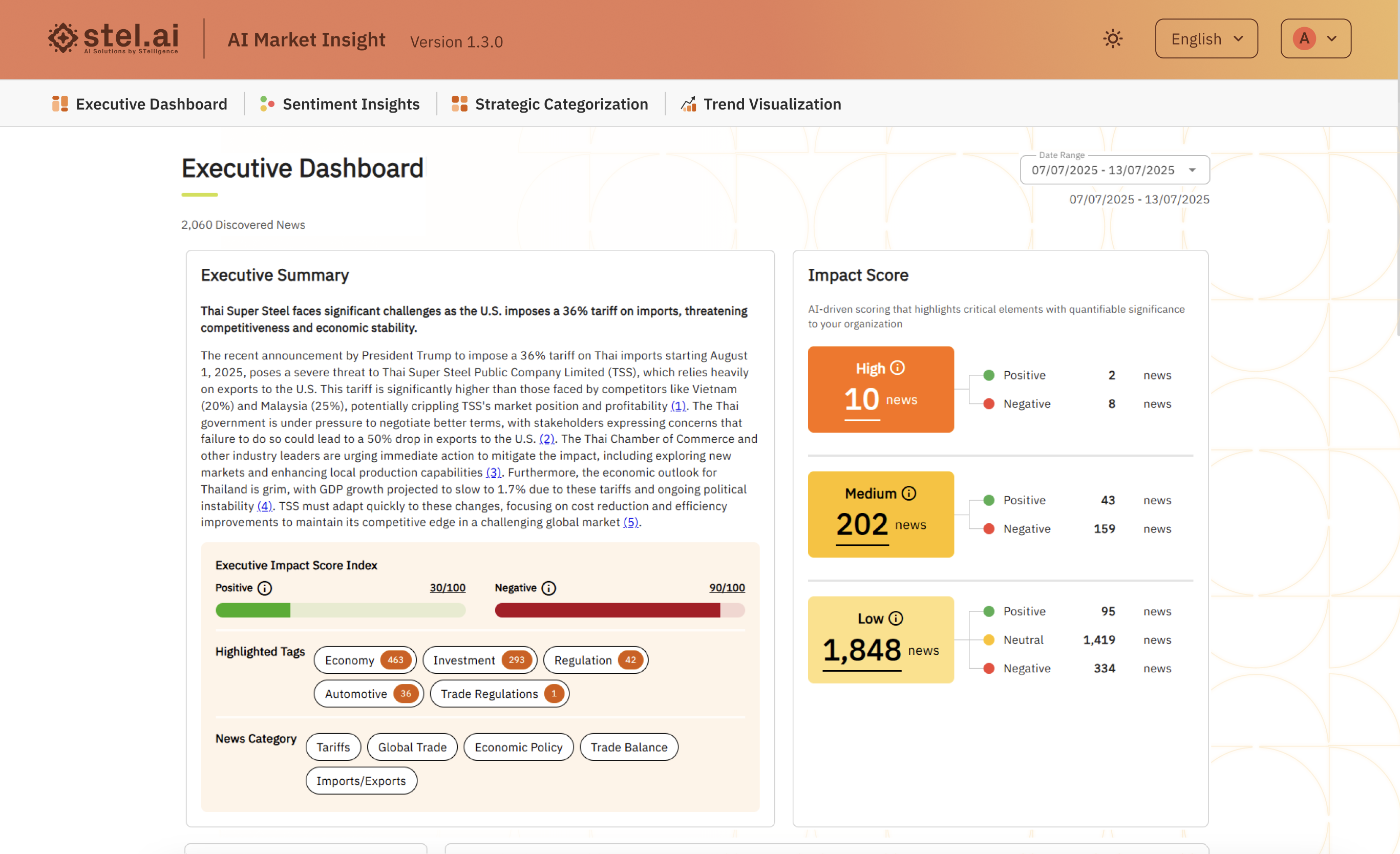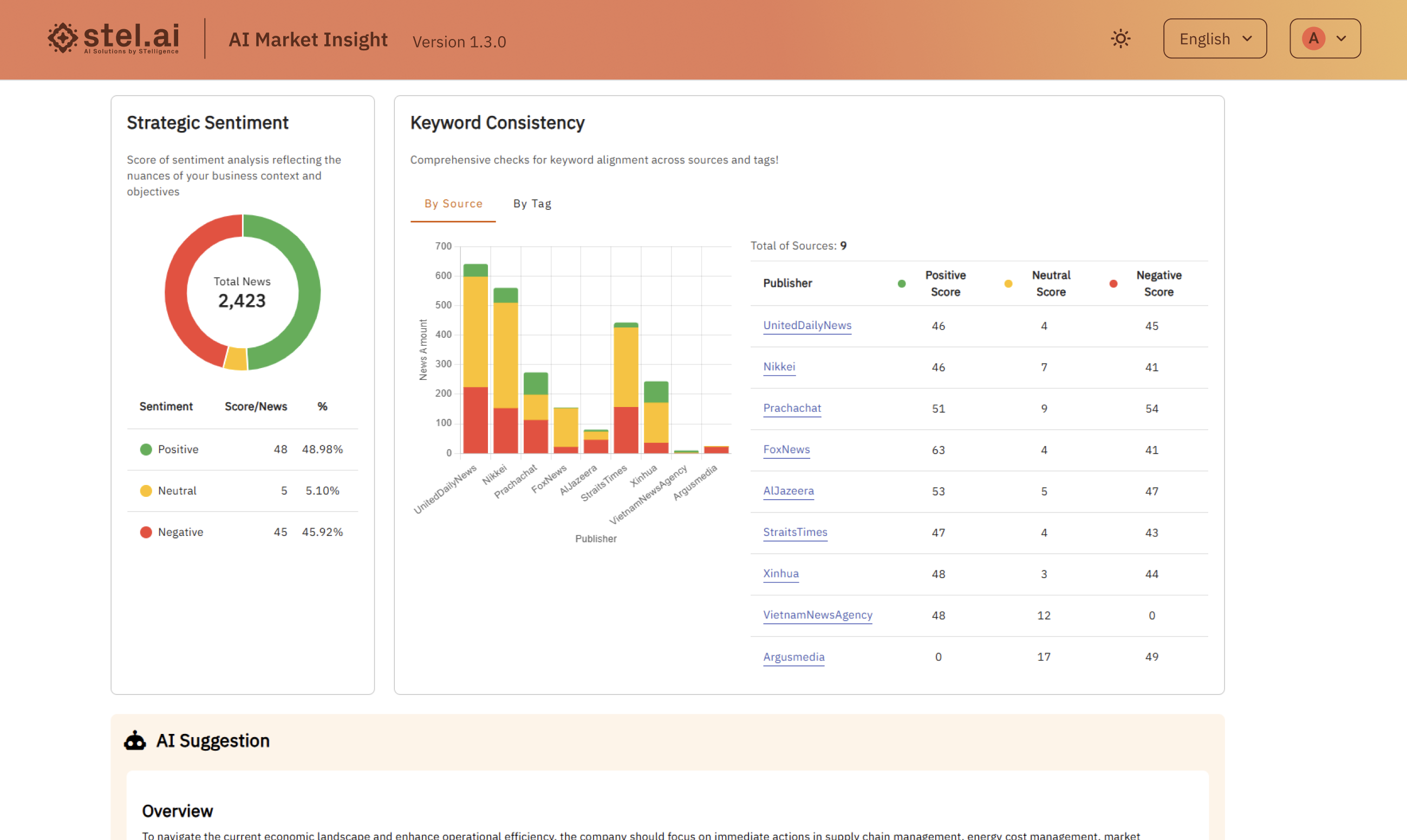AI Market Insight enables organizations to cut through information overload and instantly surface the trends, risks, and opportunities that matter. Instead of navigating fragmented news feeds, complex dashboards, or chatbot-style interfaces, teams receive tailored, multilingual, and actionable insights automatically—aligned to their industry, geography, and market position. With automated analysis, sentiment tracking, topic-level trend monitoring, and executive-grade summaries, decision-makers gain a precise, real-time understanding of market movement to act with confidence and speed.